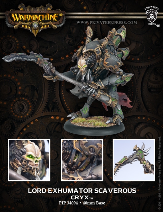 Cryx Warcaster Lord Exhumator Scaverous (white metal)A specialist in the acquisition of lore from the dead, Lord Exhumator Scaverous is one of the most potent and intelligent servants of the Nightmare Empire. Souls are both ammunition and fuel for Scaverous. Those he slays and casts aside are fortunate compared to any possessed of special lore, whose skulls and souls he preserves for horrific necromantic interrogation.The warcaster Lord Exhumator Scaverous comes in a blister (PIP 34094). A player may field one Lord Exhumator Scaverous in a Cryx army.