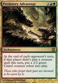 Predatory Advantage - RareSet Alara Reborn Cost 3RG Color Gold Card Type Enchantment Rarity Rare Card Text At the end of each opponent's turn, if that player didn't play a creature spell this turn, put a 2/2 green Lizard creature token into play.