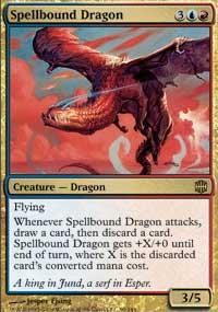 Spellbound Dragon - RareSet Alara Reborn Cost 3UR Color Gold Card Type Creature — Dragon P / T 3 / 5 Rarity Rare Card Text Flying Whenever Spellbound Dragon attacks, draw a card, then discard a card. Spellbound Dragon gets +X/+0 until end of turn, where X is the discarded card's converted mana cost.